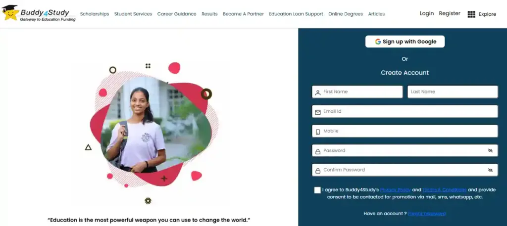 • इसके बाद account create करें मांगी गई सारी जानकारी जैसे नाम मोबाइल नंबर और ईमेल को ध्यान से भरे और policy और terms को पढ़कर teek करें और sign up पर क्लिक करें इसके अलावा आप google से भी sign up कर सकते हैं।