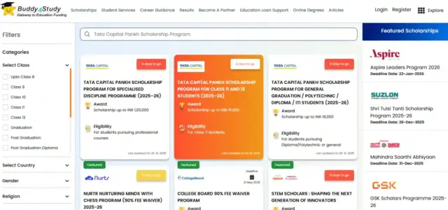 • होम पेज पर स्कॉलरशिप सर्च क्षेत्र में टाटा कैपिटल पंख स्कॉलरशिप प्रोग्राम को ढूंढे।